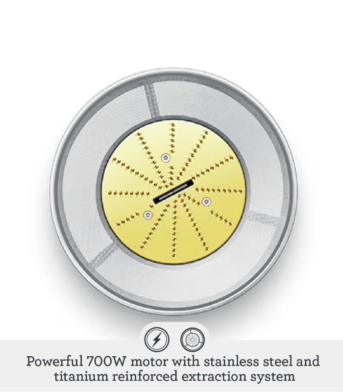 • Juicing Type: Centrifugal extraction using titanium-reinforced cutting disc and Italian-made stainless steel mesh